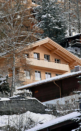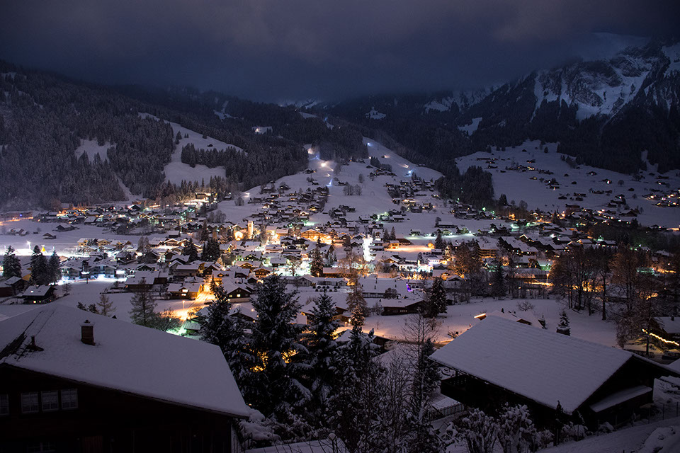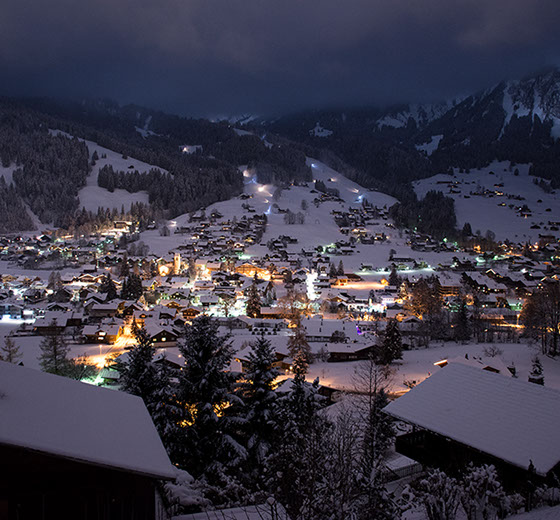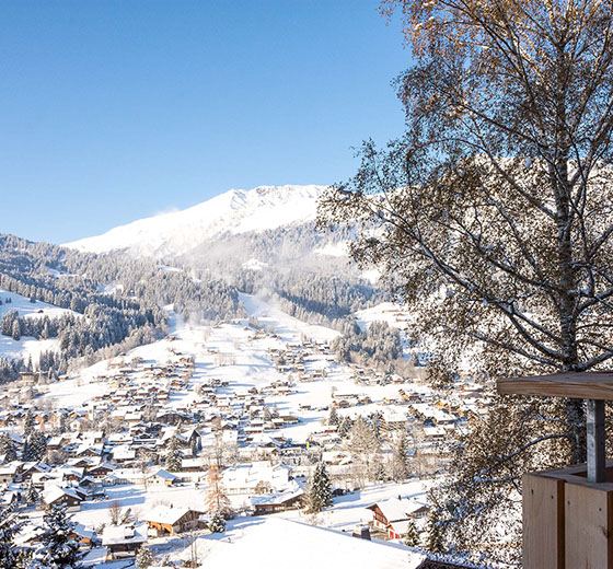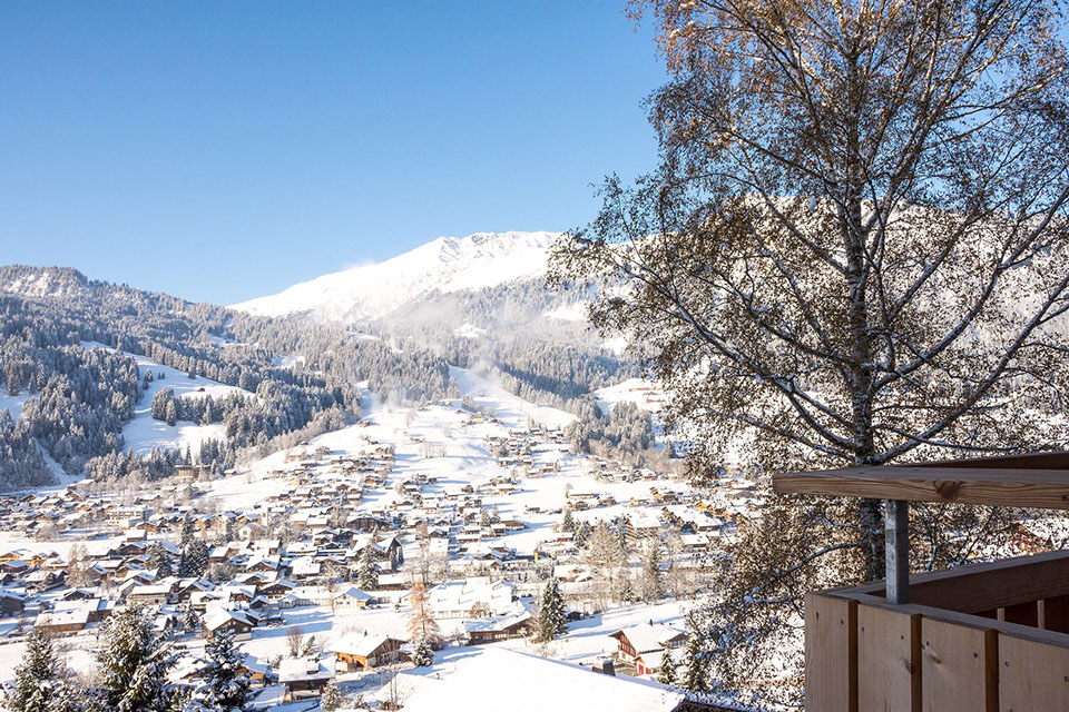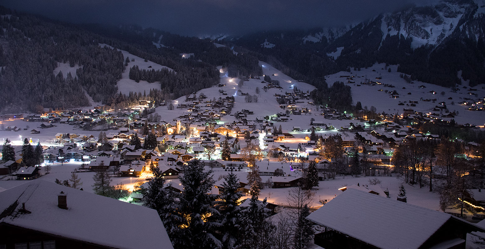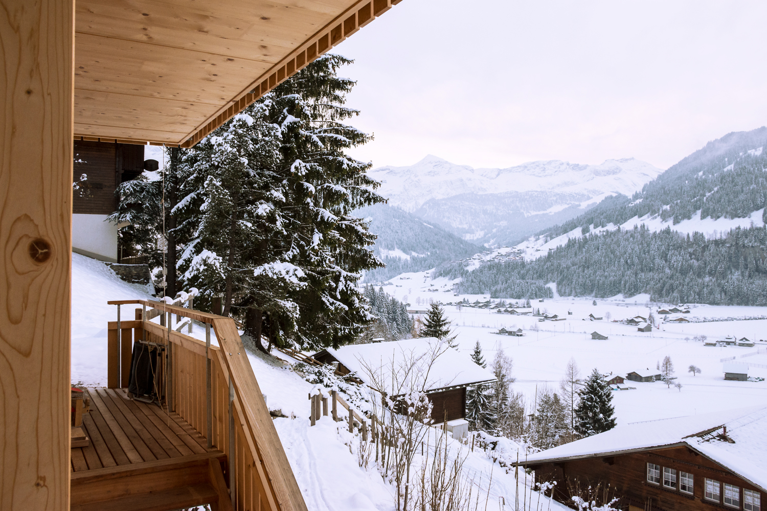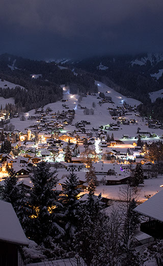 Auf dem Balkon hoch über dem Tal hörst du den Bergbach rauschen. Abends, nach dem letzten Alpenglühen, glitzern die Lichter der Lenk unter dir.